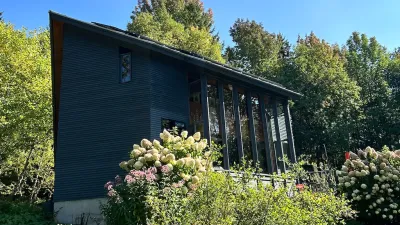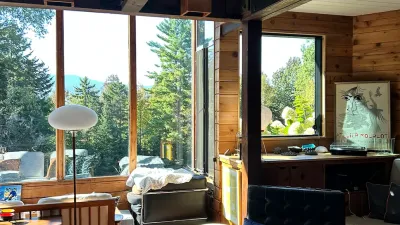 Our final stop on the tour of East Warren was our instructor Britton Rogers’ house. The home was built in the 1960s and is hexagonal in plan, giving the facade a unique and intriguing appearance. Britton described the dilapidated state of the roof as well as the water damage the home suffered from when he first purchased the property. He described the great lengths he went through to reroute the water under and around his house, as well as fix the roof with the addition of a deeper overhang. The interior of the home was warm with the glow of the sun and the deep shade of wood that covered the walls. A memorable feature was a large bump-out of windows that draped from the second story down to the living room, revealing sweeping views of Mad River Glen and allowing the sunlight to heat the living room. As my group had spent the past couple of days working out a floor plan that was a pentagon in plan view, we were excited to see how a space with more than four walls can be extremely functional without large amounts of square footage. His home was impeccably decorated and efficient, not only environmentally but also architecturally. We saw firsthand how you could turn a mid-century modern home into an environmentally friendly structure while maintaining its history and original form. A key feature of the home was its covered entryway that transitioned to the mudroom inside the house. With the harsh weather of the area, it’s essential to have shelter from the elements and a space inside to shed your clothes. Our final design hopes to include a similar covered entry and mudroom.