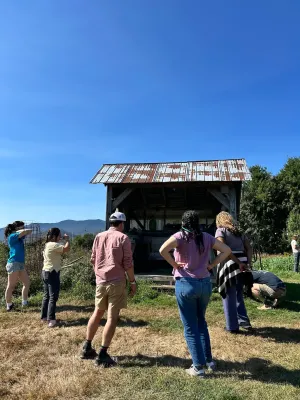 Behind the market, we visited a straw bale storage structure built by a previous Yestermorrow class. Though weathered and now home to a massive beehive, it was a beautiful example of thoughtful design: a white façade, wooden roof with deep overhangs, and an arched door with a flame-like detail engraved onto it. It had a grounded, Tuscan-inspired feel while still being suited for Vermont’s climate. The overhang provided protection from the weather and outdoor storage space. It was especially helpful to see a structure that incorporated elements we were passionate about but remained close in size to the single-occupancy housing (around 350 square feet) we’re designing for campus.