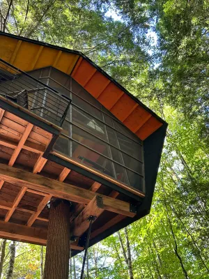 We loaded back into the van and headed into the woods for our next stop. As we walked through the woods, a treehouse suddenly loomed above us. Suspended between two trees growing through its interior, the structure had a modern, pentagonal form with an orange and black exterior. Inside, it felt like a lounge, with a large deck holding two laid-back Adirondack chairs and a second-story loft. Three of the four walls were made of screen material, allowing us to feel completely surrounded and suspended. The deck overlooked a dry riverbed, still peaceful, but it was easy to imagine how impactful the sound of flowing water would be to this already serene experience. This treehouse was a refreshing contrast to the previous structures. It was clean, modern, and uniquely built. The deck, in particular, caught our interest, something many of us are passionate about incorporating into our own designs.