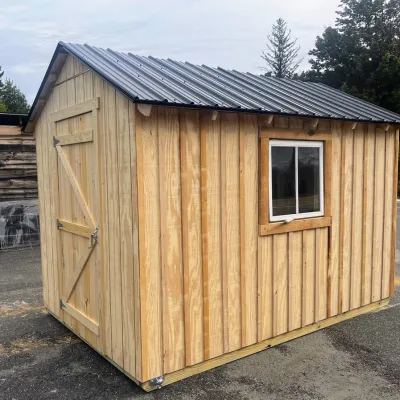 In our carpentry courses, students build small sheds that are approximately 100 square feet in size. At the end of the course, the projects are fully dried in with windows, doors, and roofing installed. There are several spec models available for $3,000 + delivery. Our sheds are sided with T1-11 and battens to create a faux board-and-batten look. Our standard roofing is silver corrugated metal. Other colors are available, but additional fees may apply. Window sashes are made from refurbished windows.